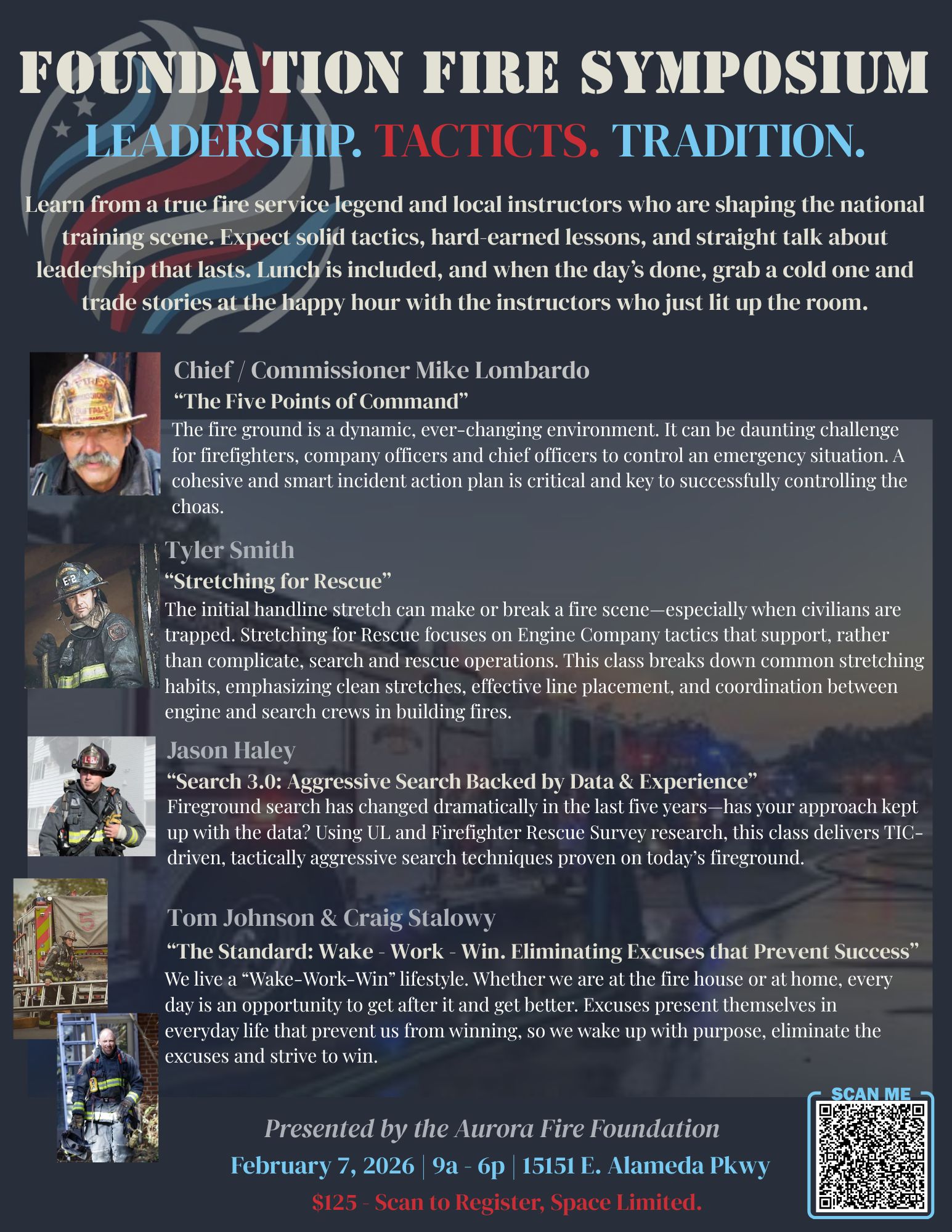 Join the Aurora Fire Foundation for a day of solid tactics, hard-earned lessons, and straight talk on leadership. We are bringing together a true fire service legend and top-tier local instructors for a symposium designed to shape the future of the fire ground.
