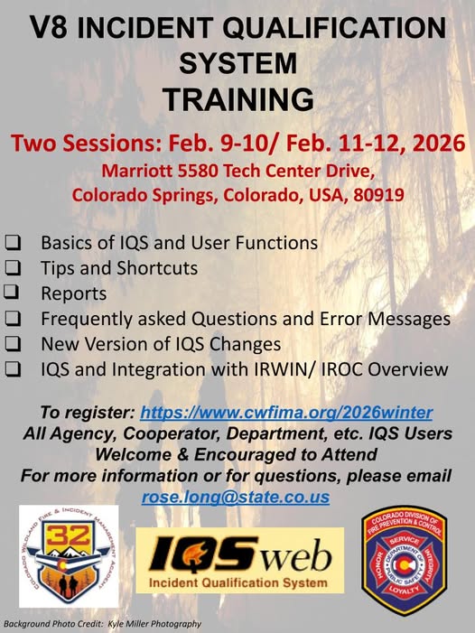 The Division of Fire Prevention & Control (DFPC) is teaming up with the Colorado Wildland Fire & Incident Management Academy (CWFIMA) for a premier training opportunity. We are excited to announce that we are bringing the Head of IQS to Colorado Springs to lead two comprehensive training sessions.